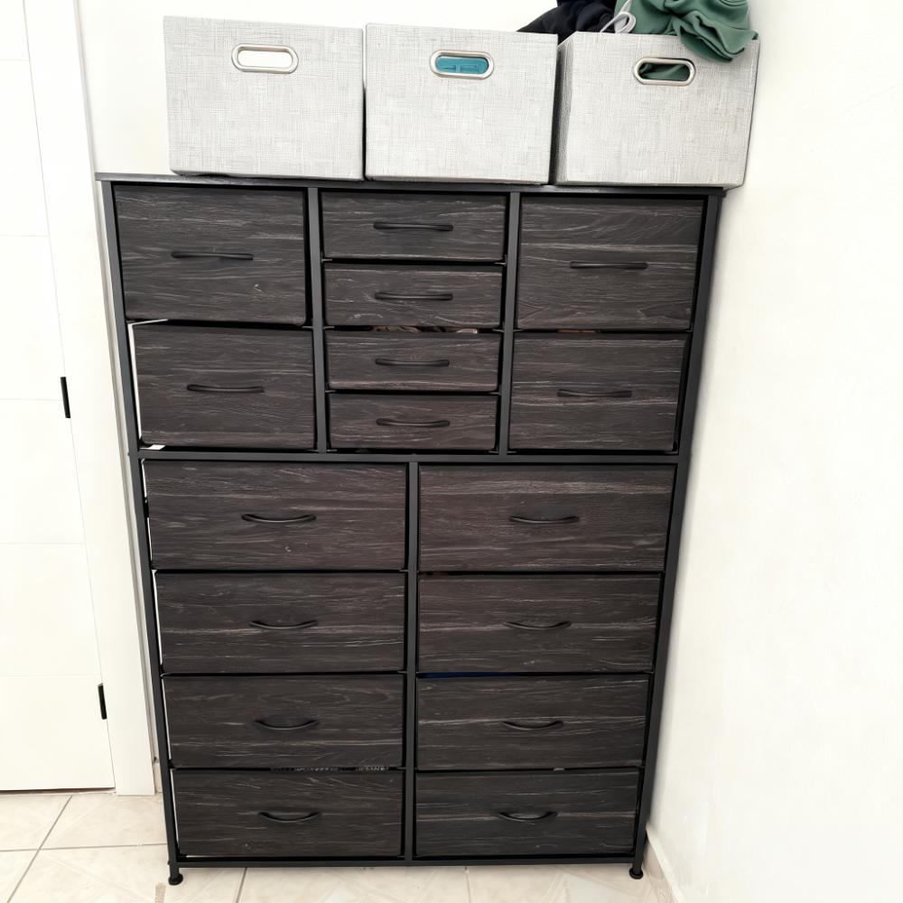 This dresser is built with a heavy-duty metal frame and a sturdy wood top reinforced with two X-shaped lacing bars, ensuring exceptional stability and strength. Its durable construction can support substantial weight, remaining solid and wobble-free even under the pressure of a full load, making it reliable enough to safely hold heavy items.