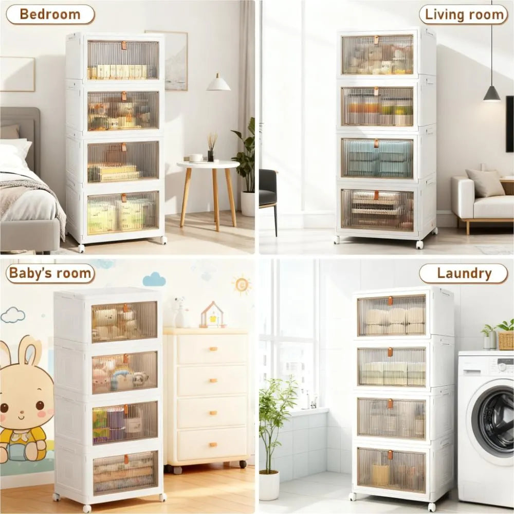 About this item✔ 【Large Capacity & Durable Material】Each storage bin floor measures 14.76 x 11 x 8.27 inches (23 QT capacity), with the 4-layer stacked unit totaling 15.35 x 11 x 32.68 inches (including wheels) and an overall 92 QT capacity. The storage containers feature high-quality PP material lids for extended durability.✔ 【Easy Assembly & Foldable Design】These plastic storage bins require no tools for quick assembly. They can be stacked and configured as bedding organizers, clothing storage, or shoe cabinets. When unused, the boxes fold flat to minimize space in homes or vehicles.✔ 【Stackable & Mobile Structure】The storage organizer bins offer stackable functionality and mobility. Each layer has matching grooves and clasps on both sides of the top to securely lock the clear bins. Four rotating wheels at the bottom enable easy movement, with 2 wheels featuring locking clasps to keep the unit stable when needed.✔ 【Versatile Storage Solution】These drawer organizers suit both indoor and outdoor storage needs, including closets, laundry rooms, bathrooms, kitchens, dog food containers, bedroom dressers, bookshelves, and car organization.✔ 【Secure & Visible Storage】The front door of each storage drawer has a built-in magnetic buckle to prevent accidental opening. The translucent front covers allow clear visibility of contents, making it easy to identify stored items - an ideal household organization assistant.