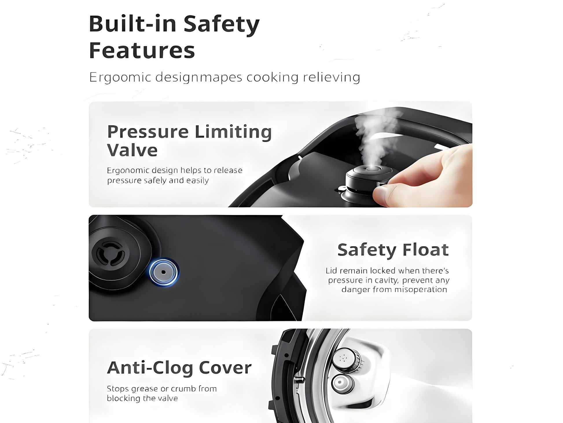 Engineered with 10 integrated safety mechanisms, including overheat protection, automatic pressure release, and a secure lid-lock system. This multi-cooker prioritizes your peace of mind, making advanced cooking techniques accessible to all home chefs.