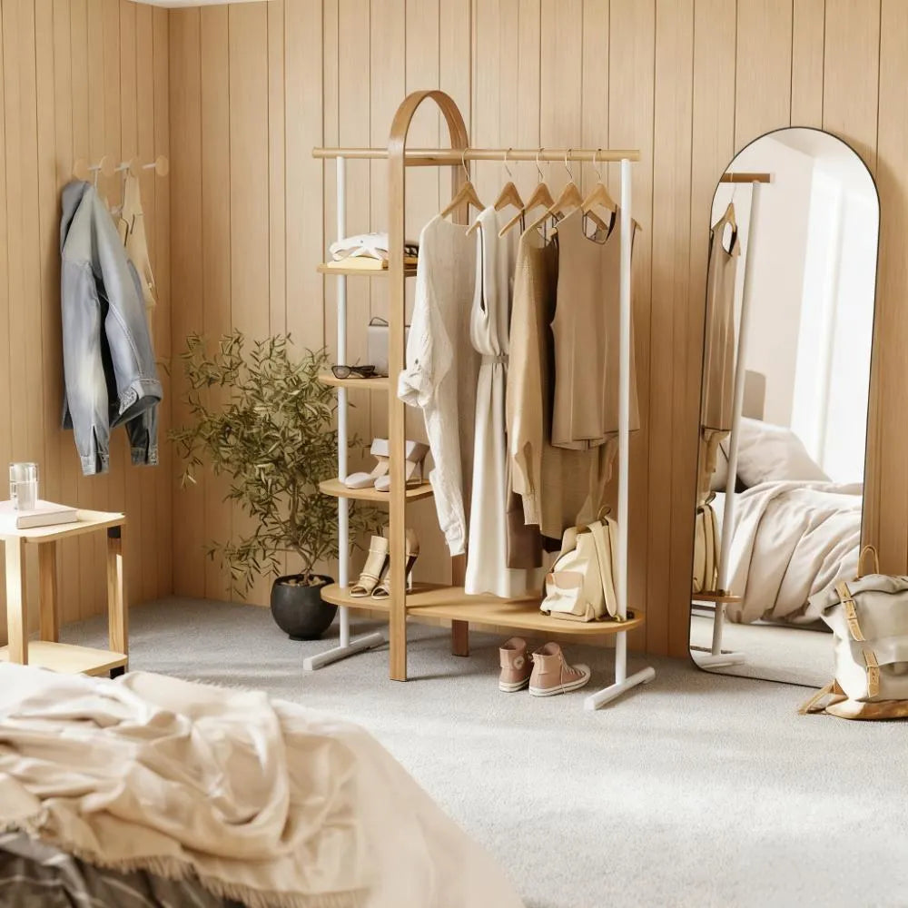 Combining soft curves with bentwood accents, this modern garment rack merges functionality with aesthetic appeal. Designed to organize and display clothing, shoes, bags, and accessories, its four space-efficient shelves and integrated steel rod provide versatile storage solutions.